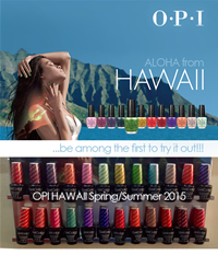 Hawaii Collection by OPI brings the fresh, bright colours of its namesake island to nails and toes for Spring/Summer 2015. This new collection features a palette ranging from muted tones of mint, peach, pink and nude to bolder hues of coral, green, purple and gold to deep tones of mauve, violet, brick red and shimmery blue.