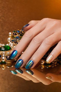 Nails are ornate miniature masterpieces richly polished in shades of Locket Love, Fine Vermilion, Rose Brocade, Crimson Sash, Plum Paisley and Indigo Frock from the CND Modern Folklore collection and detailed in intricate patterns inspired by Faberge and Fine Tapestry. Old world artesian techniques of embossing, engraving and embellishing transforms nails into treasures to be coveted this season.