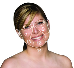 Rather than analysing the skin in general terms, Face Mapping skin analysis divides the face into 14 distinct zones, each with it's own set of potential problems and unique needs. Using the zones and the Dermalogica Face Map as a guide, the therapist is able to conduct an inch-by-inch, methodical analysis of the facial landscape, guaranteeing that the subsequent professional treatment and home care prescription will fully address each client's concerns.